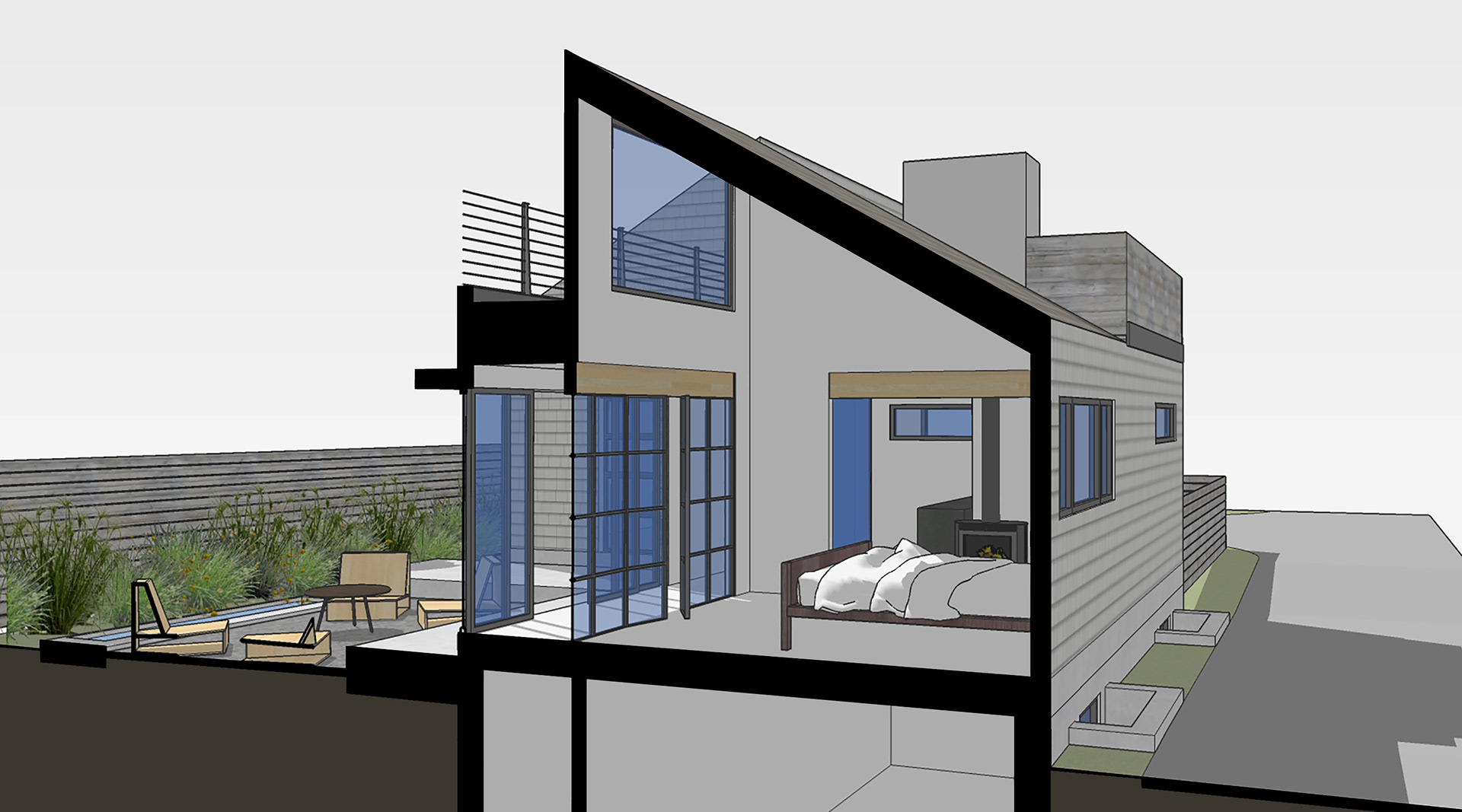 The existing roof line of this mid-century bungalow is extruded into the backyard and pulled apart, creating additional bedrooms in one volume, an artist studio in the other, and a courtyard between.