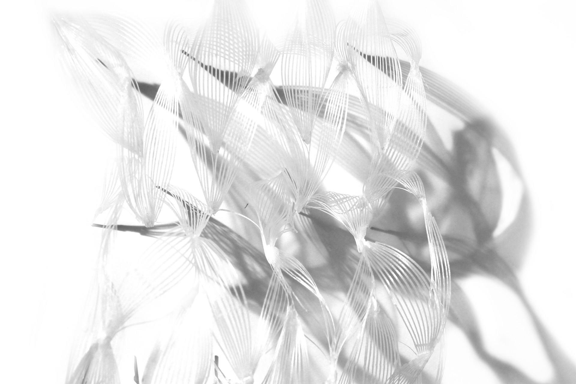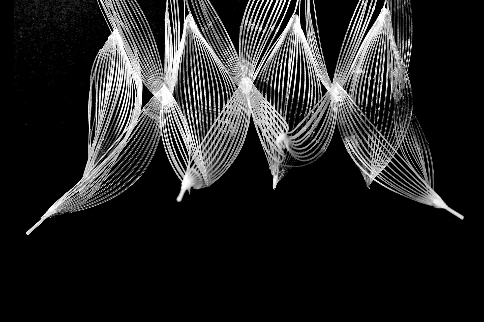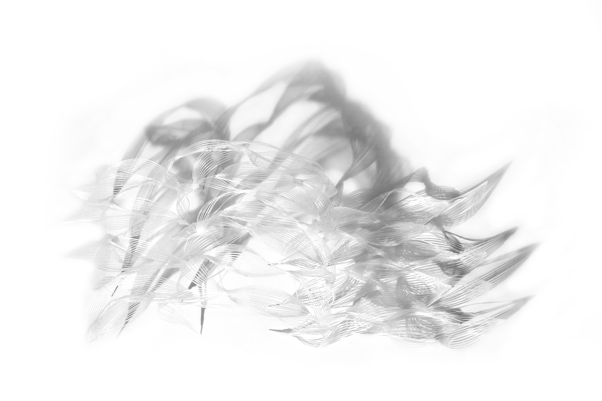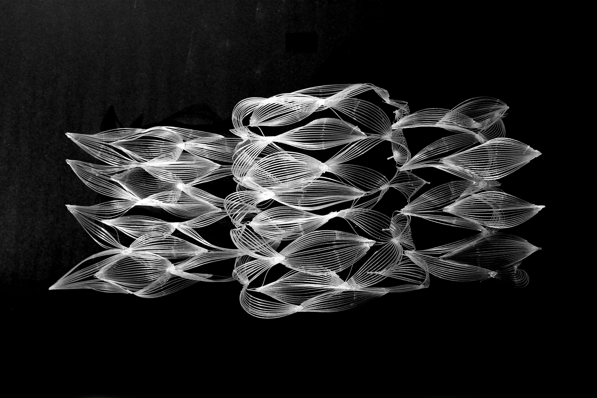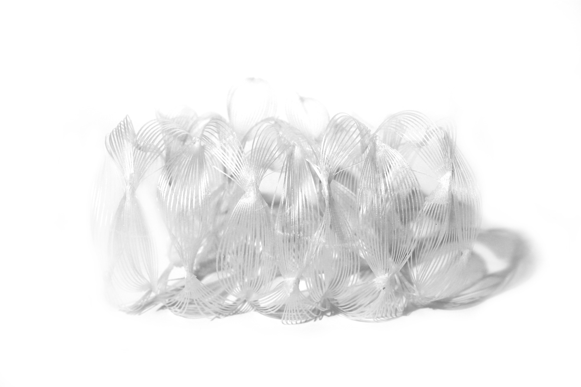 An experimental textile of bent, woven, and glued 3D prints.